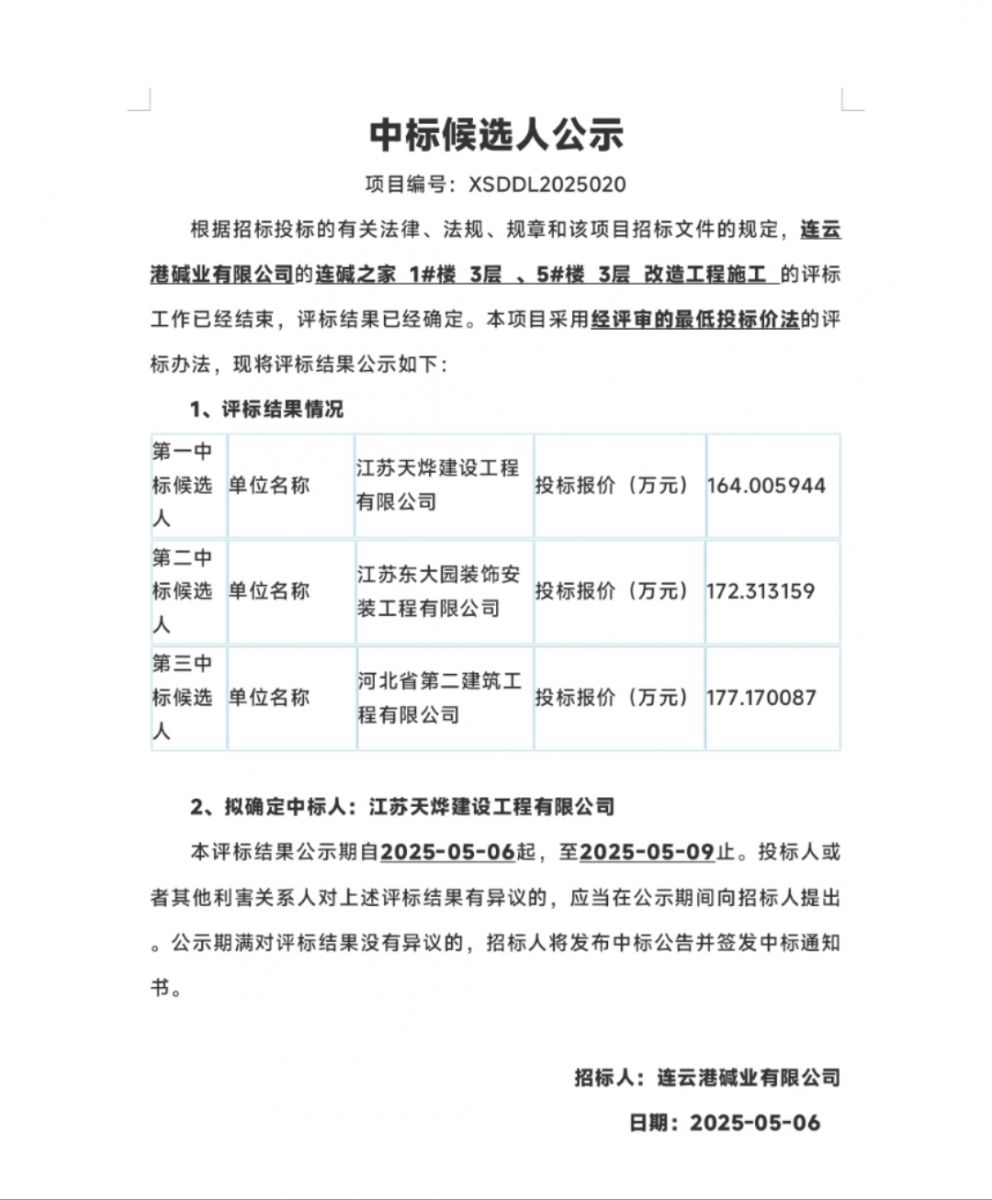 連云港堿業(yè)有限公司的連堿之家1#樓 3層 、5#樓 3層 改造工程施工中標候選人公示