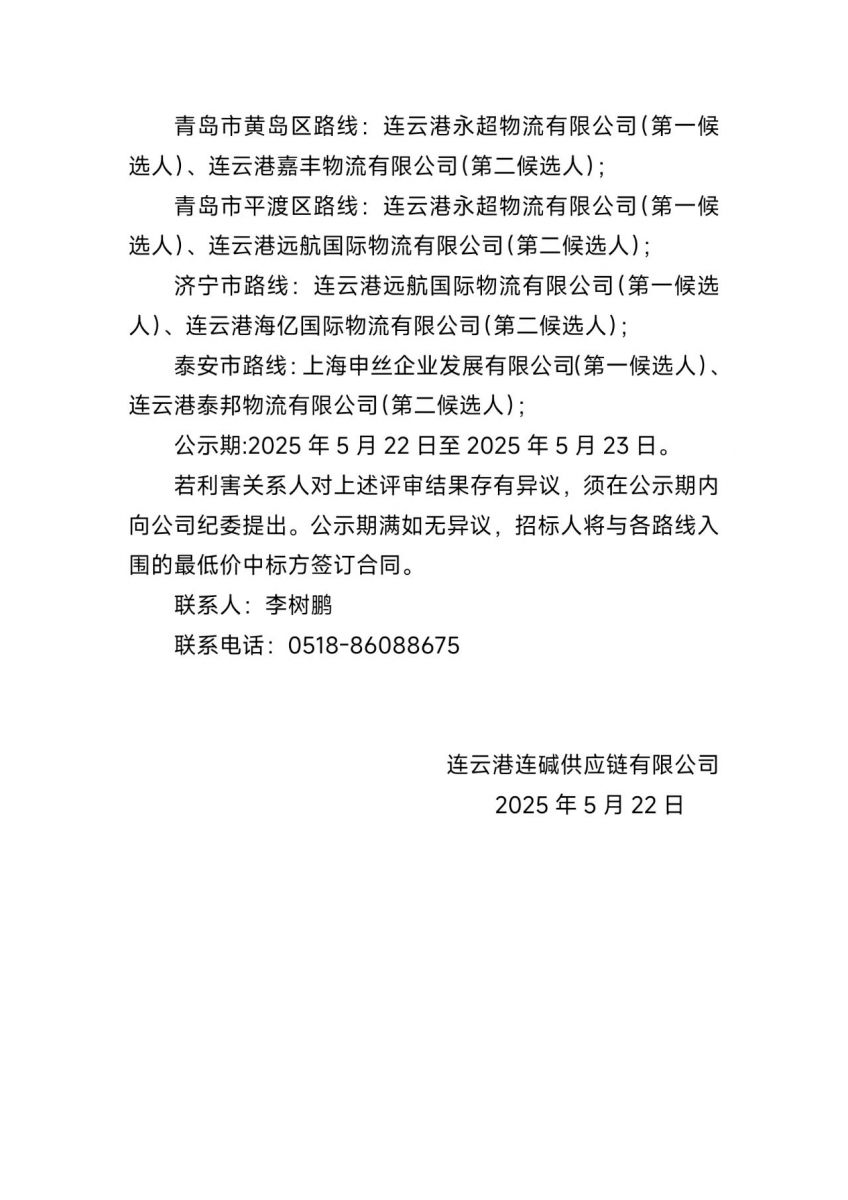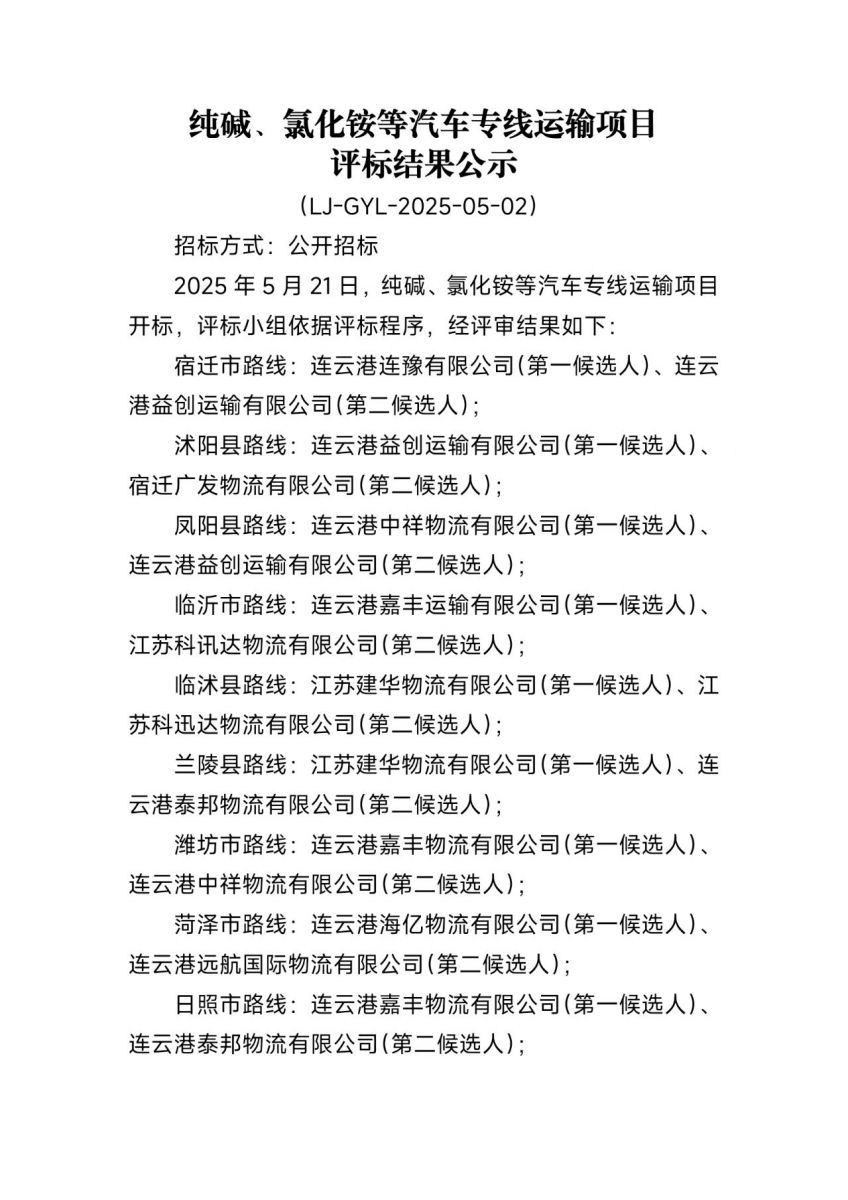 連云港連堿供應鏈有限公司純堿、氯化銨等汽車(chē)專(zhuān)線(xiàn)運輸項目評標結果公示