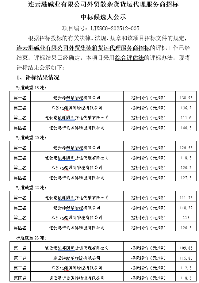 連云港堿業(yè)有限公司外貿(mào)集裝箱貨運代理服務(wù)商招標中標候選人公示