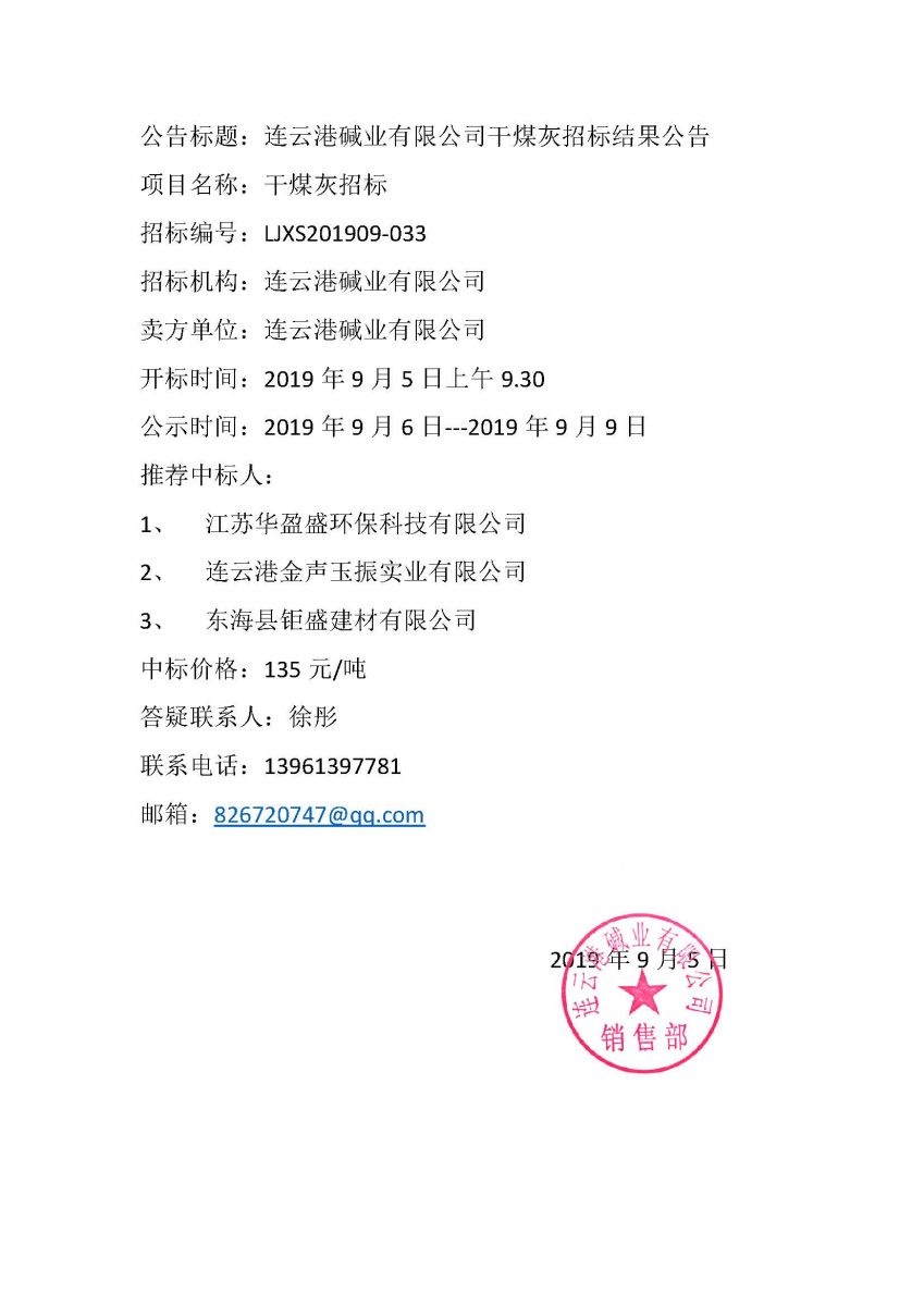 連云港堿業(yè)有限公司干煤灰招標結果公告