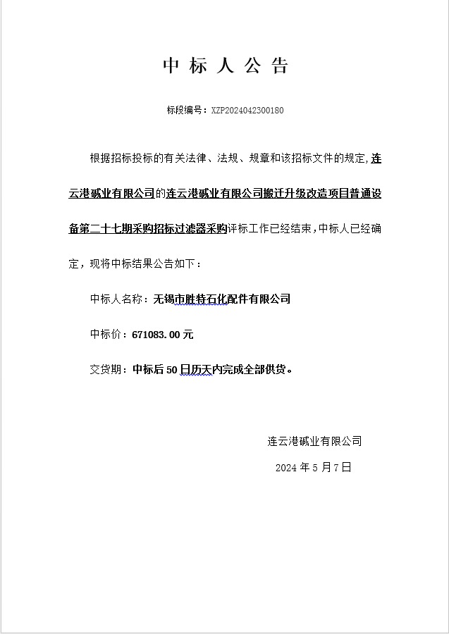搬遷升級改造項目普通設備第二十七期采購招標過(guò)濾器采購中標人公告