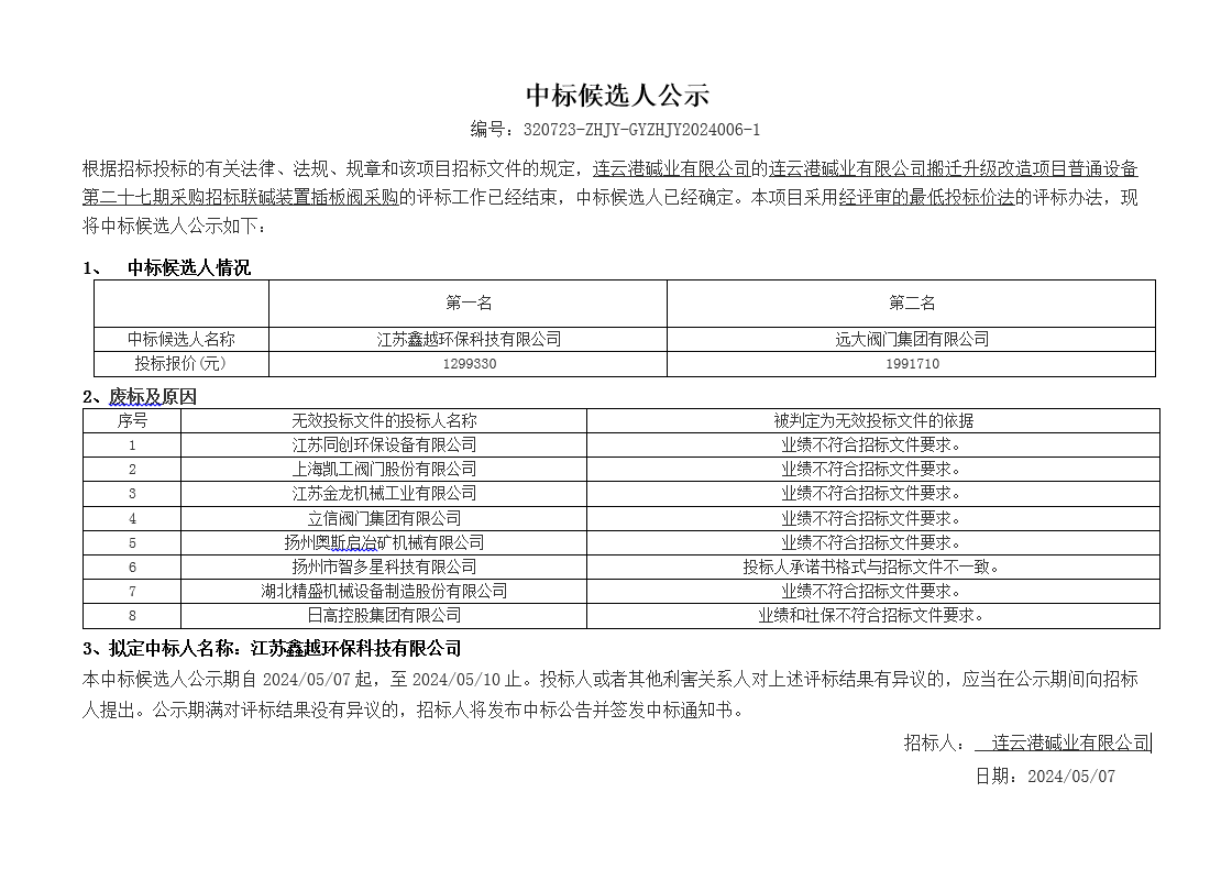 搬遷升級改造項目普通設備第二十七期采購招標聯(lián)堿裝置插板閥采購中標候選人公示