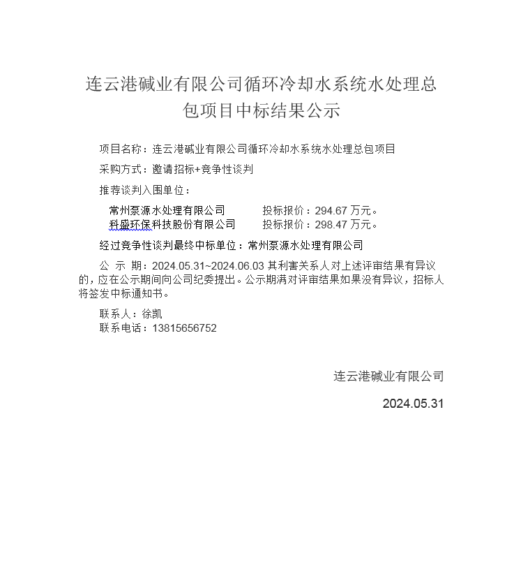 連云港堿業(yè)有限公司循環(huán)冷卻水系統(tǒng)水處理總包項目中標結果公示
