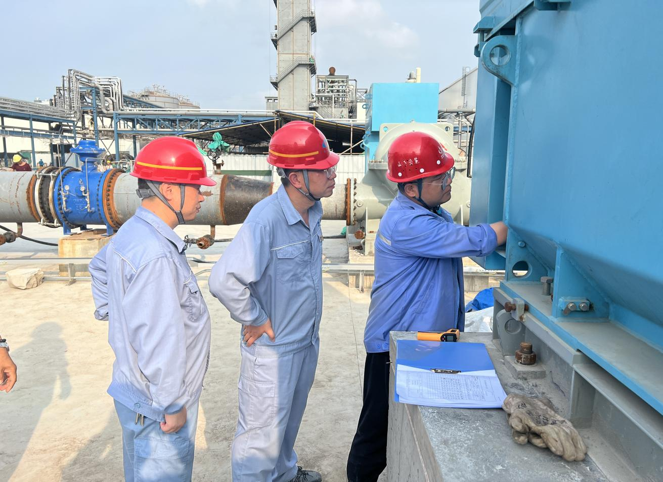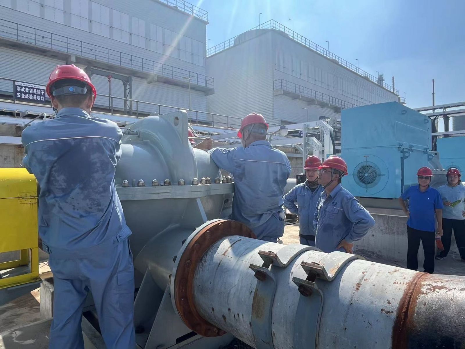 上午11:28,伴隨著(zhù)“具備條件,啟動(dòng)電機”指令的發(fā)出,操作人員按下空分循環(huán)水泵P820101A“啟動(dòng)”開(kāi)關(guān),電機開(kāi)始高速旋轉,隨后操作人員依次開(kāi)啟P820101B、C??辗盅h(huán)水泵單機試車(chē)的現場(chǎng)“熱辣滾燙”,大家衣衫被汗水濕透,但熱情依舊高漲。操作人員每隔15分鐘就詳細檢查記錄電機的軸溫、轉速、振值等指標。